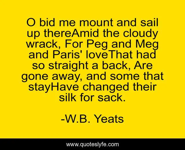 This page presents the quote "O bid me mount and sail up thereAmid the cloudy wrack, For Peg and Meg and Paris' loveThat had so straight a back, Are gone away, and some that stayHave changed their silk for sack.". Author of this quote is W.B. Yeats. .