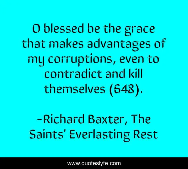 This page presents the quote "O blessed be the grace that makes advantages of my corruptions, even to contradict and kill themselves (648).". Author of this quote is Richard Baxter, The Saints' Everlasting Rest. This quote is about providence, corruption, grace,.