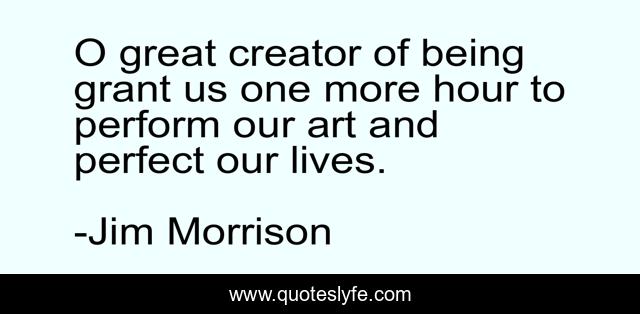 This page presents the quote "O great creator of being grant us one more hour to perform our art and perfect our lives.". Author of this quote is Jim Morrison. This quote is about perfect, life, art, hour, creator, being, lives, time,.