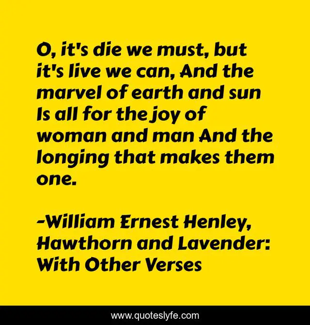 This page presents the quote "O, it's die we must, but it's live we can, And the marvel of earth and sun Is all for the joy of woman and man And the longing that makes them one.". Author of this quote is William Ernest Henley, Hawthorn and Lavender: With Other Verses. This quote is about lust, passion, poetry,.