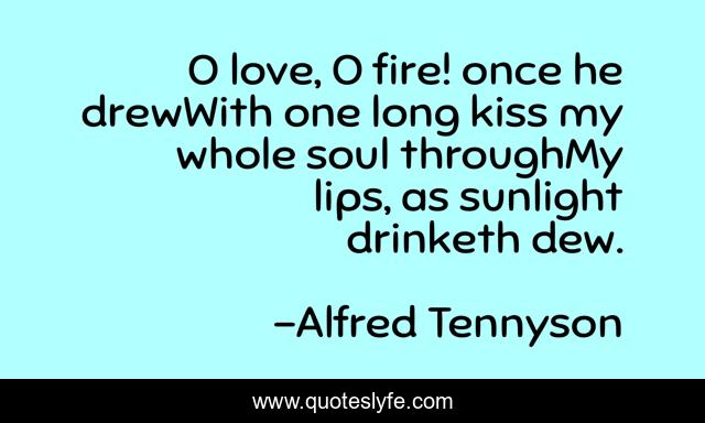 This page presents the quote "O love, O fire! once he drewWith one long kiss my whole soul throughMy lips, as sunlight drinketh dew.". Author of this quote is Alfred Tennyson. This quote is about literature, deep, elegant, moving, inspirational, emotional, enthusiasm,.