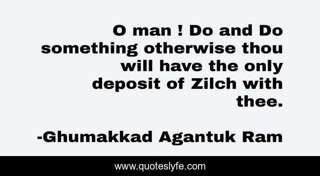 This page presents the quote "O man ! Do and Do something otherwise thou will have the only deposit of Zilch with thee.". Author of this quote is Ghumakkad Agantuk Ram. This quote is about life-philosophy, insipirational, realistic,.