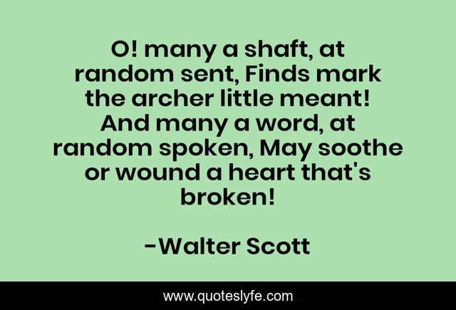 This page presents the quote "O! many a shaft, at random sent, Finds mark the archer little meant! And many a word, at random spoken, May soothe or wound a heart that's broken!". Author of this quote is Walter Scott. This quote is about heart, random, broken,.