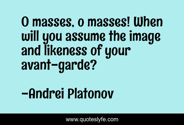 This page presents the quote "O masses, o masses! When will you assume the image and likeness of your avant-garde?". Author of this quote is Andrei Platonov. This quote is about privilege, irony, communism, revolution, avant-garde,.