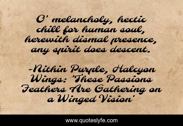 "Nithin Purple, Halcyon Wings: 'These Passions Feathers Are Gathering on a Winged Vision' Quotes." Quoteslyfe.com, 2025. Tue. 09 Dec. 2025. <https://www.quoteslyfe.com/quote/O-melancholy-hectic-chill-for-human-soul-22766>.