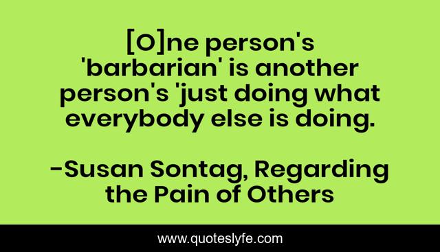 This page presents the quote "[O]ne person's 'barbarian' is another person's 'just doing what everybody else is doing.". Author of this quote is Susan Sontag, Regarding the Pain of Others. This quote is about perception, normalcy, barbarians, standards, culture, civilization, prejudice, perspective, double-standards,.