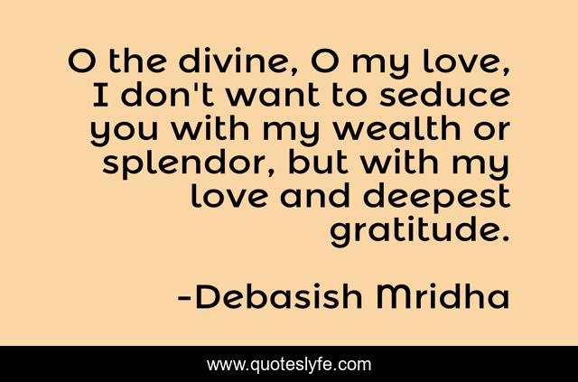 This page presents the quote "O the divine, O my love, I don't want to seduce you with my wealth or splendor, but with my love and deepest gratitude.". Author of this quote is Debasish Mridha. This quote is about life, love, knowledge, inspirational, intelligence, philosophy, wisdom, quotes, affection,.