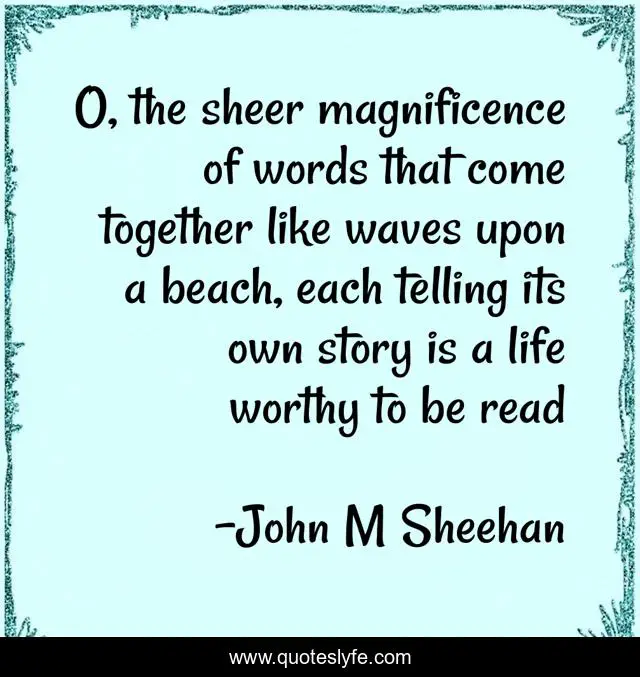 This page presents the quote "O, the sheer magnificence of words that come together like waves upon a beach, each telling its own story is a life worthy to be read". Author of this quote is John M Sheehan. This quote is about words-to-inspire-you, words-have-power, words-to-live-by, words-of-wisdom,.