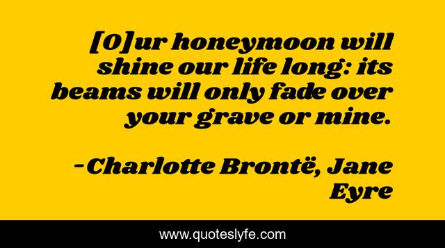 This page presents the quote "[O]ur honeymoon will shine our life long: its beams will only fade over your grave or mine.". Author of this quote is Charlotte Brontë, Jane Eyre. This quote is about life, death, honeymoon, jane-eyre, charlotte-bronte, marriage, edward-fairfax-rochester, matrimony,.