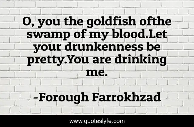 This page presents the quote "O, you the goldfish ofthe swamp of my blood.Let your drunkenness be pretty.You are drinking me.". Author of this quote is Forough Farrokhzad. This quote is about blood, drunkenness,.