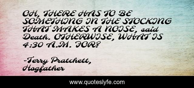 This page presents the quote "OH, THERE HAS TO BE SOMETHING IN THE STOCKING THAT MAKES A NOISE, said Death. OTHERWISE, WHAT IS 4:30 A.M. FOR?". Author of this quote is Terry Pratchett, Hogfather. This quote is about death, noise,.