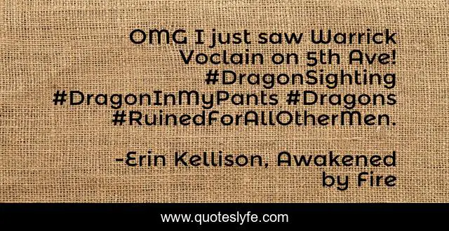 This page presents the quote "OMG I just saw Warrick Voclain on 5th Ave! #DragonSighting #DragonInMyPants #Dragons #RuinedForAllOtherMen.". Author of this quote is Erin Kellison, Awakened by Fire. This quote is about dragons-romance, vampires, paranormal-romance,.