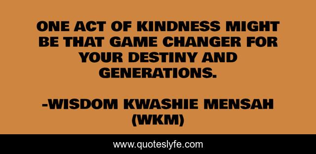 This page presents the quote "ONE ACT OF KINDNESS MIGHT BE THAT GAME CHANGER FOR YOUR DESTINY AND GENERATIONS.". Author of this quote is WISDOM KWASHIE MENSAH (WKM). This quote is about motivation, wkm, destiny, whm, hqm, rymm-petit, kindness, generations, inspiration,.