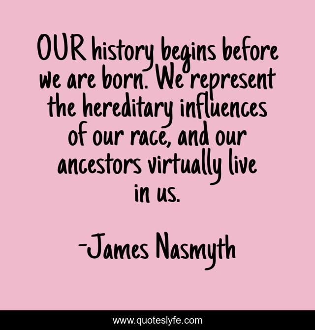 This page presents the quote "OUR history begins before we are born. We represent the hereditary influences of our race, and our ancestors virtually live in us.". Author of this quote is James Nasmyth. This quote is about born, live, race,.