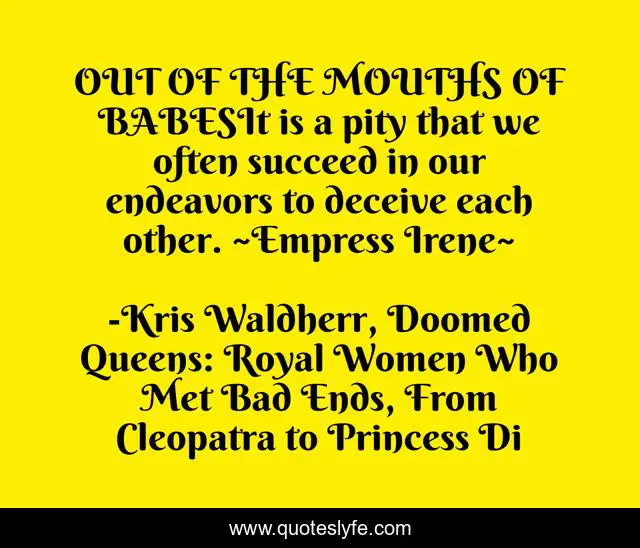 This page presents the quote "OUT OF THE MOUTHS OF BABESIt is a pity that we often succeed in our endeavors to deceive each other. ~Empress Irene~". Author of this quote is Kris Waldherr, Doomed Queens: Royal Women Who Met Bad Ends, From Cleopatra to Princess Di. This quote is about deception, success, women-s-strength, deceit, empress-irene, women,.