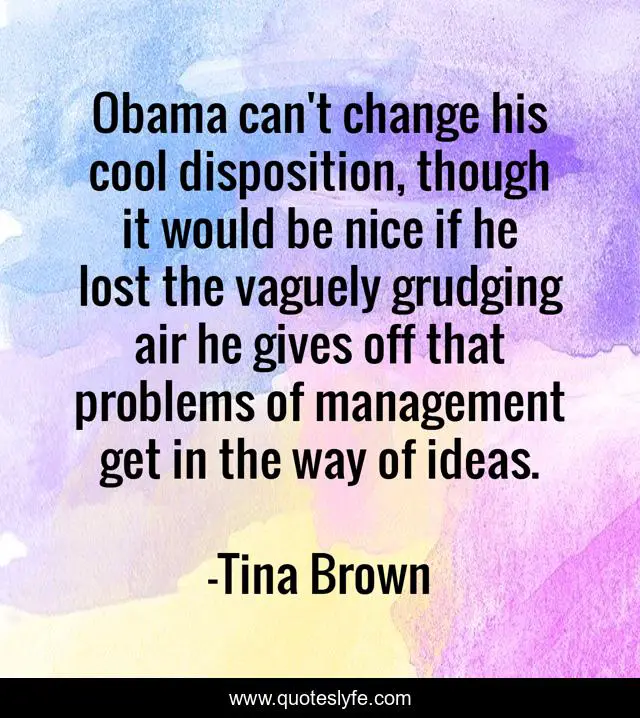 This page presents the quote "Obama can't change his cool disposition, though it would be nice if he lost the vaguely grudging air he gives off that problems of management get in the way of ideas.". Author of this quote is Tina Brown. This quote is about management, problems, change,.