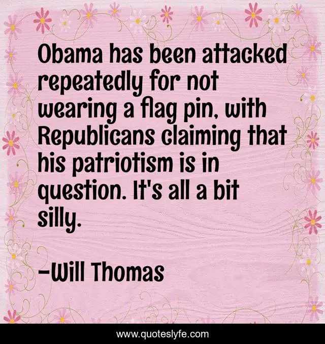 This page presents the quote "Obama has been attacked repeatedly for not wearing a flag pin, with Republicans claiming that his patriotism is in question. It's all a bit silly.". Author of this quote is Will Thomas. This quote is about silly, flag, question,.
