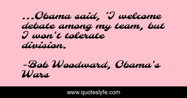 This page presents the quote "...Obama said, 'I welcome debate among my team, but I won't tolerate division.". Author of this quote is Bob Woodward, Obama's Wars. This quote is about afghanistan, government, obama-s-war, military, war, bob-woodward,.