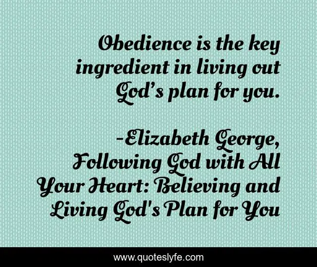 This page presents the quote "Obedience is the key ingredient in living out God’s plan for you.". Author of this quote is Elizabeth George, Following God with All Your Heart: Believing and Living God's Plan for You. This quote is about heart, god, elizabeth-george, obedience, christianity, faith-in-god, gods-plan,.