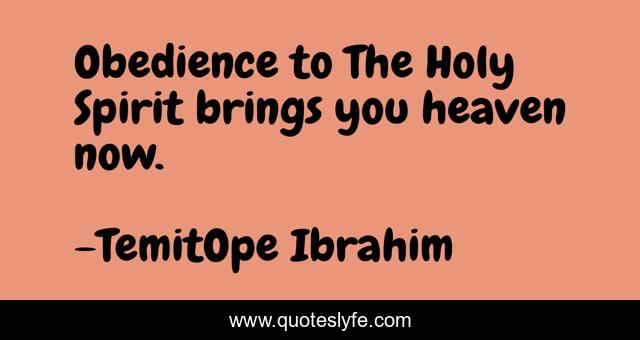 This page presents the quote "Obedience to The Holy Spirit brings you heaven now.". Author of this quote is TemitOpe Ibrahim. This quote is about heaven, inspirational, life-lesson, heaven-on-earth, peace, obedience, bliss, truth, enthusiasm,.