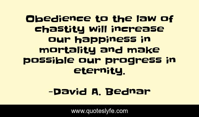 This page presents the quote "Obedience to the law of chastity will increase our happiness in mortality and make possible our progress in eternity.". Author of this quote is David A. Bednar. This quote is about progress, law, obedience,.