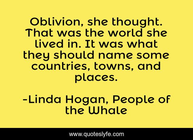 This page presents the quote "Oblivion, she thought. That was the world she lived in. It was what they should name some countries, towns, and places.". Author of this quote is Linda Hogan, People of the Whale. This quote is about oblivion, men, nature,.