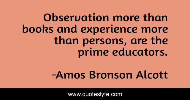 This page presents the quote "Observation more than books and experience more than persons, are the prime educators.". Author of this quote is Amos Bronson Alcott. This quote is about education, observation,.