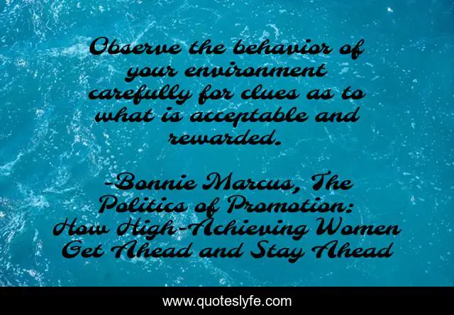 This page presents the quote "Observe the behavior of your environment carefully for clues as to what is acceptable and rewarded.". Author of this quote is Bonnie Marcus, The Politics of Promotion: How High-Achieving Women Get Ahead and Stay Ahead. This quote is about environment, leadership, workplace, behavior, women,.