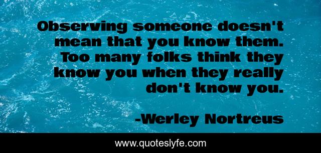 This page presents the quote "Observing someone doesn't mean that you know them. Too many folks think they know you when they really don't know you.". Author of this quote is Werley Nortreus. This quote is about respecting-others, integrity-knowledge, self-esteem,.