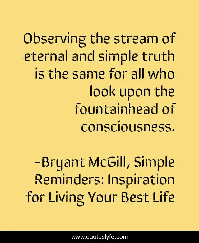 This page presents the quote "Observing the stream of eternal and simple truth is the same for all who look upon the fountainhead of consciousness.". Author of this quote is Bryant McGill, Simple Reminders: Inspiration for Living Your Best Life. This quote is about spirituality, consciousness, external, truth, observation,.