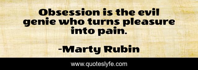 This page presents the quote "Obsession is the evil genie who turns pleasure into pain.". Author of this quote is Marty Rubin. This quote is about obsession, pain, evil, pleasure,.