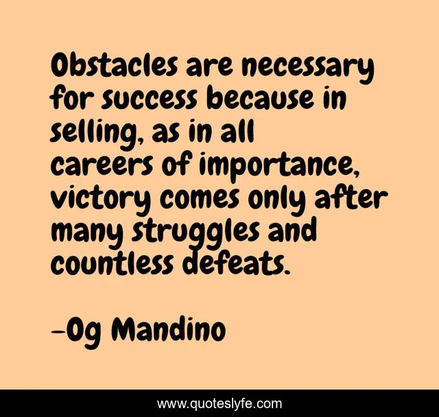 This page presents the quote "Obstacles are necessary for success because in selling, as in all careers of importance, victory comes only after many struggles and countless defeats.". Author of this quote is Og Mandino. This quote is about selling, victory, obstacles,.