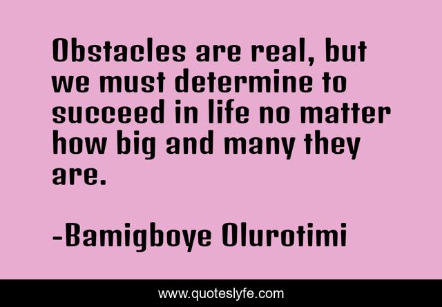 This page presents the quote "Obstacles are real, but we must determine to succeed in life no matter how big and many they are.". Author of this quote is Bamigboye Olurotimi. This quote is about life, success, big, obstacles, choice, challenges, roadblocks, up-and-down, determination,.