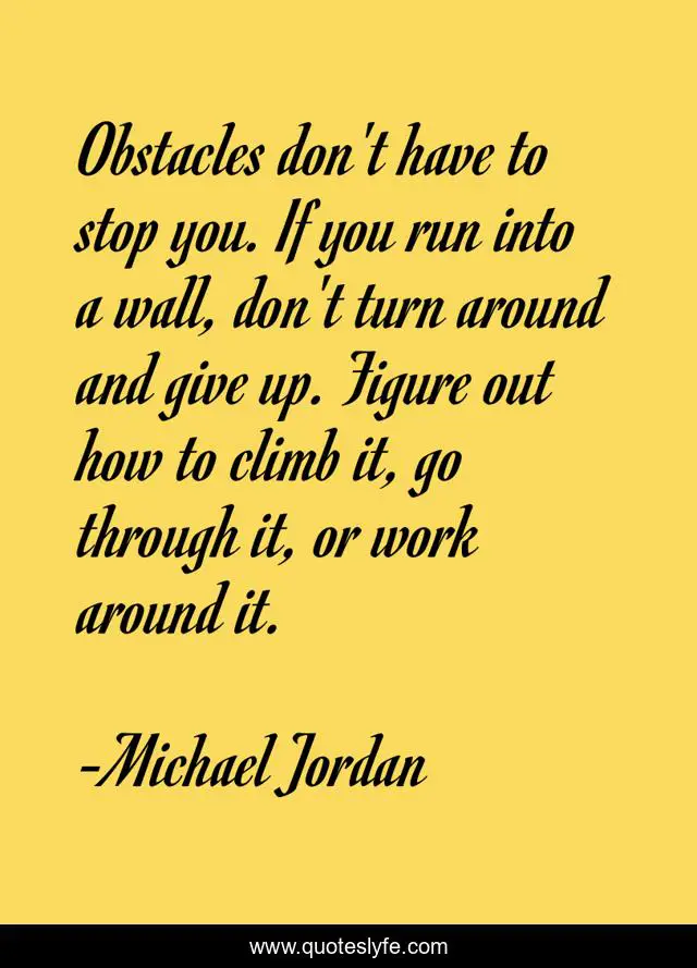 This page presents the quote "Obstacles don't have to stop you. If you run into a wall, don't turn around and give up. Figure out how to climb it, go through it, or work around it.". Author of this quote is Michael Jordan. This quote is about climb, obstacles,.