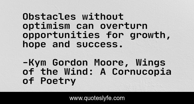 This page presents the quote "Obstacles without optimism can overturn opportunities for growth, hope and success.". Author of this quote is Kym Gordon Moore, Wings of the Wind: A Cornucopia of Poetry. This quote is about opportunities-in-life, optimism, inspiration,.