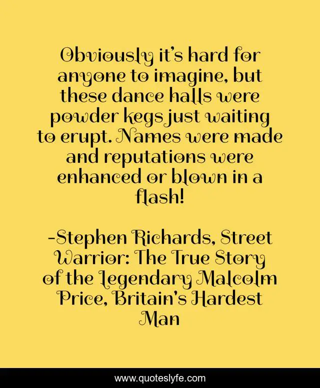 This page presents the quote "Obviously it’s hard for anyone to imagine, but these dance halls were powder kegs just waiting to erupt. Names were made and reputations were enhanced or blown in a flash!". Author of this quote is Stephen Richards, Street Warrior: The True Story of the Legendary Malcolm Price, Britain's Hardest Man. This quote is about malcolm-price, welsh-hard-man-in-society, street-fighter, hard-man, violence,.