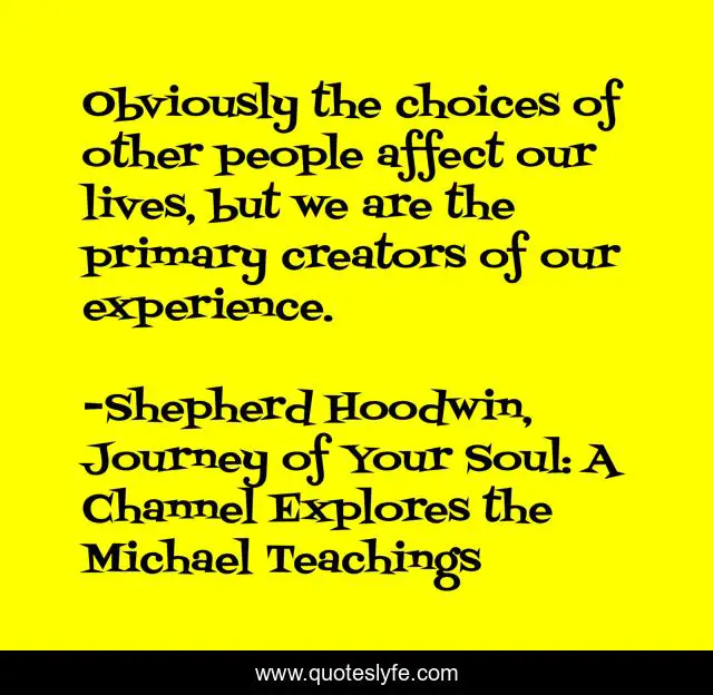 This page presents the quote "Obviously the choices of other people affect our lives, but we are the primary creators of our experience.". Author of this quote is Shepherd Hoodwin, Journey of Your Soul: A Channel Explores the Michael Teachings. This quote is about journey, soul, choice,.