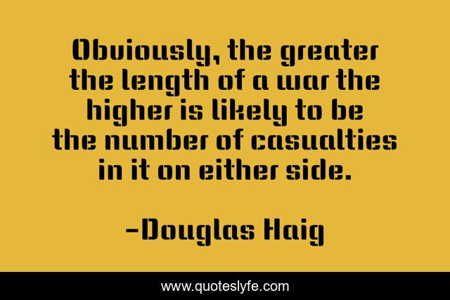 This page presents the quote "Obviously, the greater the length of a war the higher is likely to be the number of casualties in it on either side.". Author of this quote is Douglas Haig. This quote is about higher, side, number,.