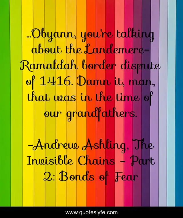 This page presents the quote "...Obyann, you're talking about the Landemere-Ramaldah border dispute of 1416. Damn it, man, that was in the time of our grandfathers.". Author of this quote is Andrew Ashling, The Invisible Chains - Part 2: Bonds of Fear. This quote is about sins-of-the-fathers, feuds, land-disputes, anger, grudges, borders,.