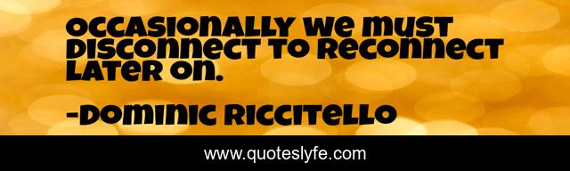 This page presents the quote "Occasionally we must disconnect to reconnect later on.". Author of this quote is Dominic Riccitello. This quote is about love, quote, finding-your-path, leaving, meant-to-be, reconnect, disconnect, affection,.