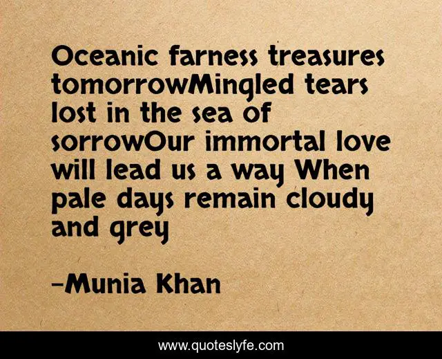 This page presents the quote "Oceanic farness treasures tomorrowMingled tears lost in the sea of sorrowOur immortal love will lead us a way When pale days remain cloudy and grey". Author of this quote is Munia Khan. This quote is about mingle, days, sea, love-hurts, love, pale, oceanic, lovers, treasure,.