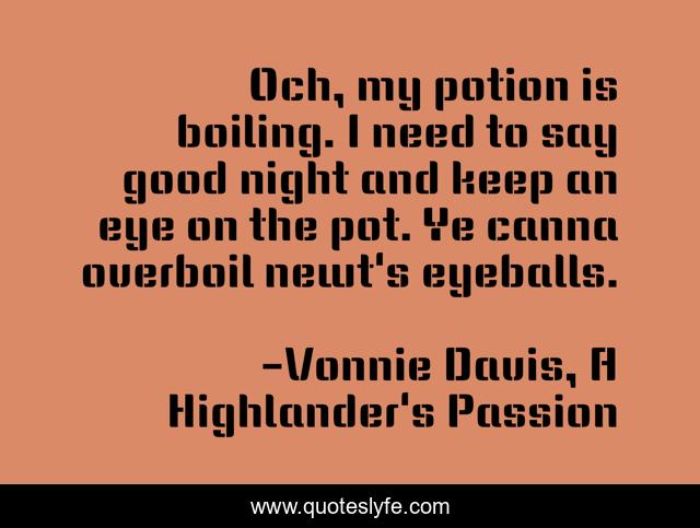 This page presents the quote "Och, my potion is boiling. I need to say good night and keep an eye on the pot. Ye canna overboil newt's eyeballs.". Author of this quote is Vonnie Davis, A Highlander's Passion. This quote is about highlanders-romance, bear-shifters, witches,.