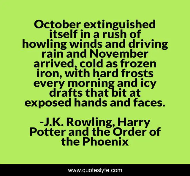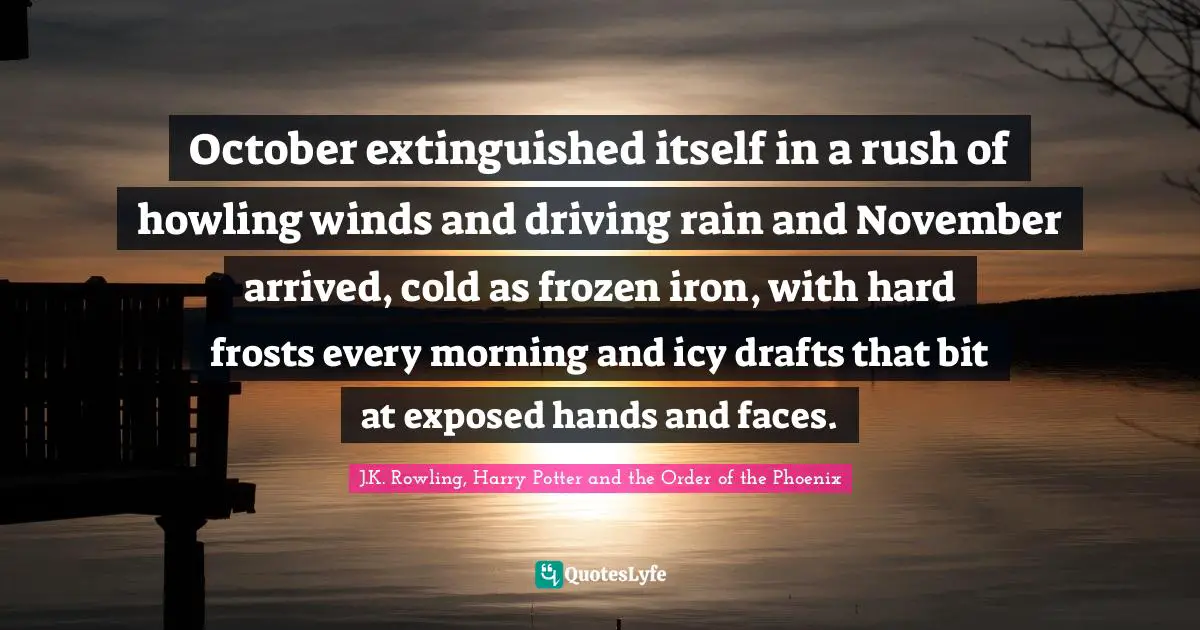 This page presents the quote "October extinguished itself in a rush of howling winds and driving rain and November arrived, cold as frozen iron, with hard frosts every morning and icy drafts that bit at exposed hands and faces.". Author of this quote is J.K. Rowling, Harry Potter and the Order of the Phoenix. This quote is about harry-potter, frozen, frost, rain, weather, cold, november, winter,.