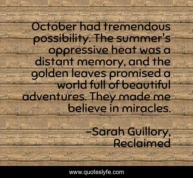 This page presents the quote "October had tremendous possibility. The summer's oppressive heat was a distant memory, and the golden leaves promised a world full of beautiful adventures. They made me believe in miracles.". Author of this quote is Sarah Guillory, Reclaimed. This quote is about miracles, october, possibility,.