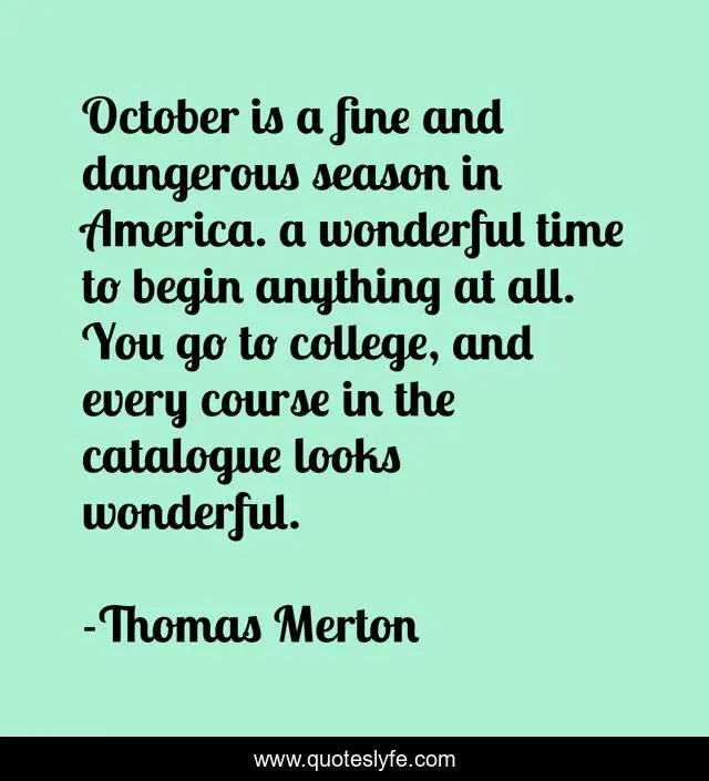 This page presents the quote "October is a fine and dangerous season in America. a wonderful time to begin anything at all. You go to college, and every course in the catalogue looks wonderful.". Author of this quote is Thomas Merton. This quote is about america, college, october,.