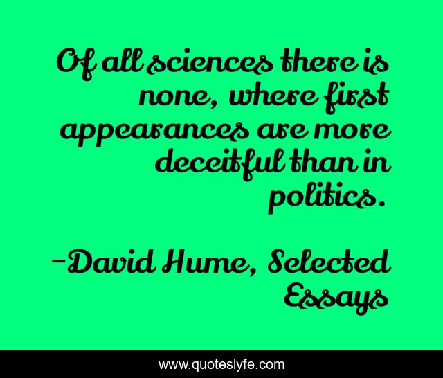 This page presents the quote "Of all sciences there is none, where first appearances are more deceitful than in politics.". Author of this quote is David Hume, Selected Essays. This quote is about politics, certainty, scepticism,.