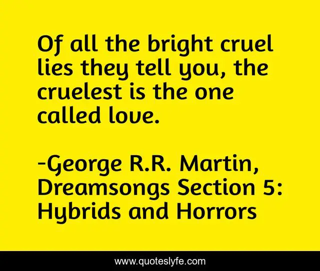This page presents the quote "Of all the bright cruel lies they tell you, the cruelest is the one called love.". Author of this quote is George R.R. Martin, Dreamsongs Section 5: Hybrids and Horrors. This quote is about lies, love, affection,.