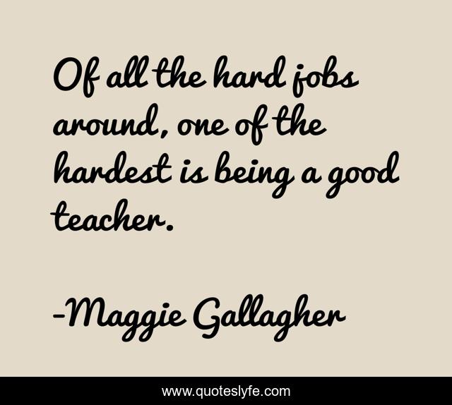 This page presents the quote "Of all the hard jobs around, one of the hardest is being a good teacher.". Author of this quote is Maggie Gallagher. This quote is about being, good, good teacher,.