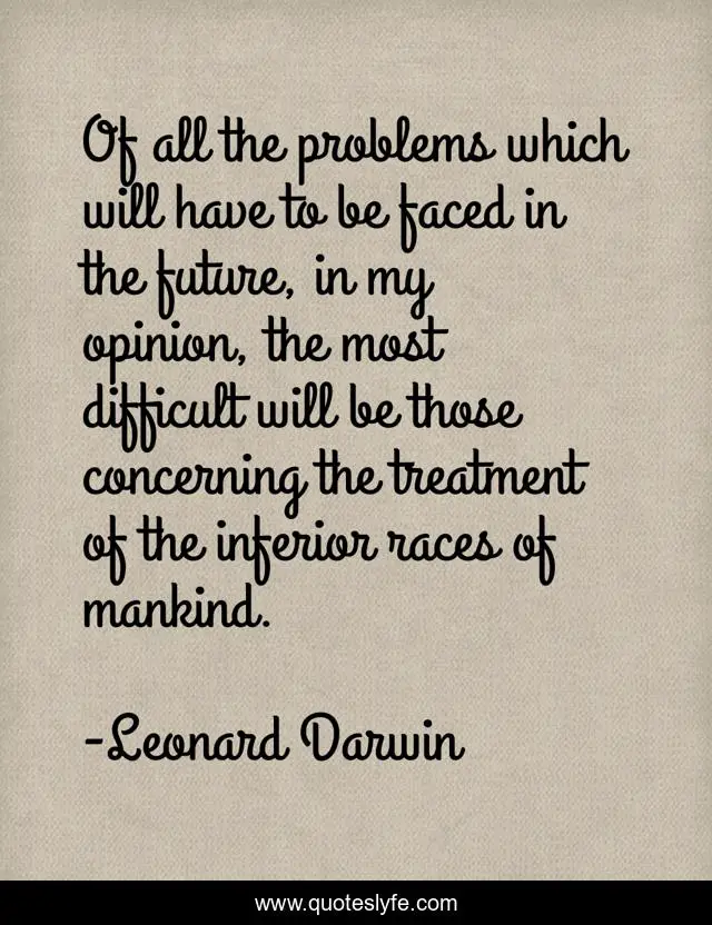 This page presents the quote "Of all the problems which will have to be faced in the future, in my opinion, the most difficult will be those concerning the treatment of the inferior races of mankind.". Author of this quote is Leonard Darwin. This quote is about evolution, racial-superiority, population-control, racism, eugenics, social-darwinism, darwinism,.