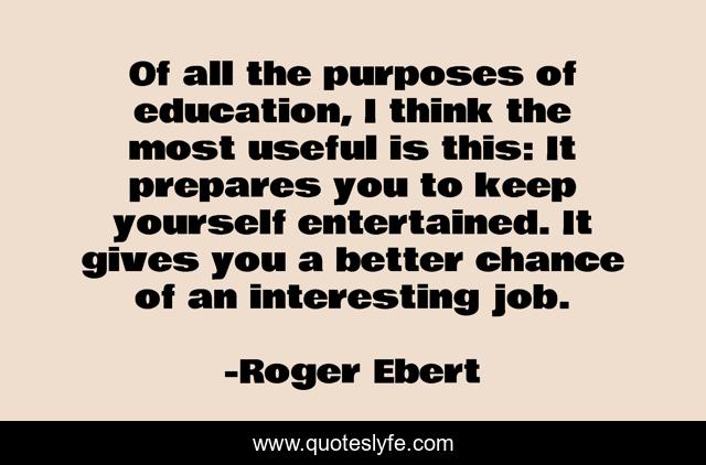 This page presents the quote "Of all the purposes of education, I think the most useful is this: It prepares you to keep yourself entertained. It gives you a better chance of an interesting job.". Author of this quote is Roger Ebert. .